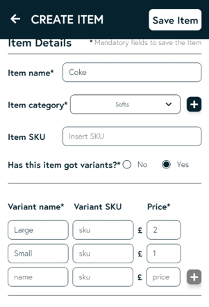 - Has this item got variants? - Variants are good for drink sizes e.g. Large or Small.