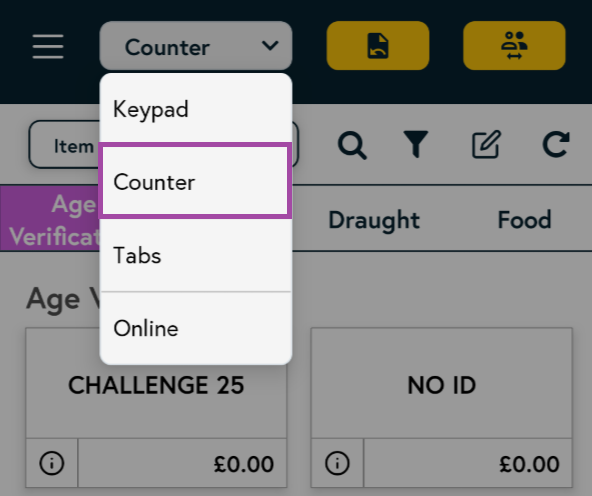 Before you can access the Item List, you must ensure the counter is selected using the dropdown menu at the top of the app.