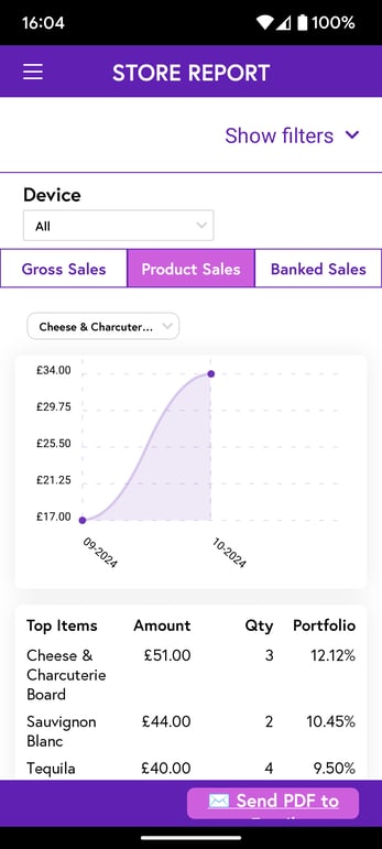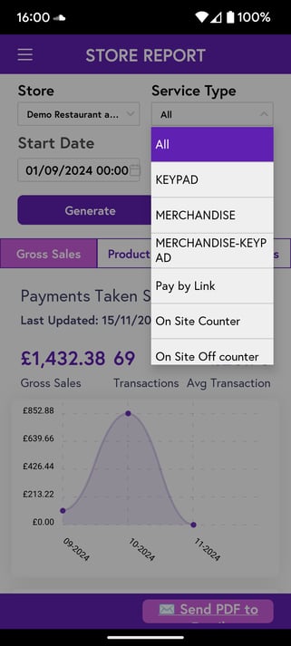 - Tap Site Report to view data for a specific site, or tap Store Report to view data for a particular store.