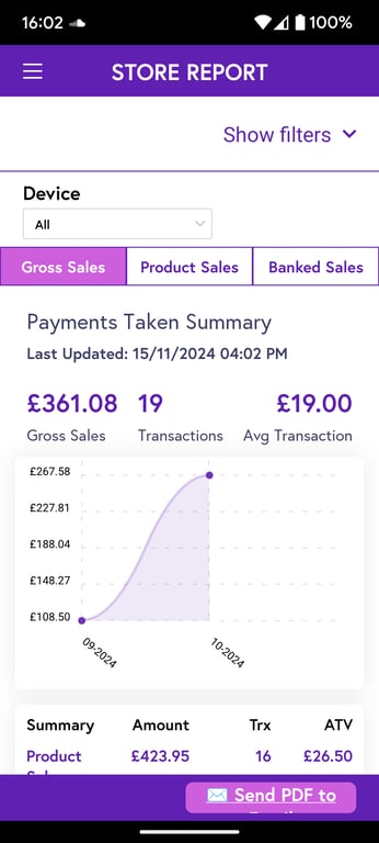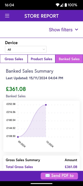 Banked Sales: Total amount banked after fees, showing the net sales ready for payout. This includes a summary of banked sales, owned stores' banked sales, merchant service charges, and payment type breakdowns for financial reconciliation.