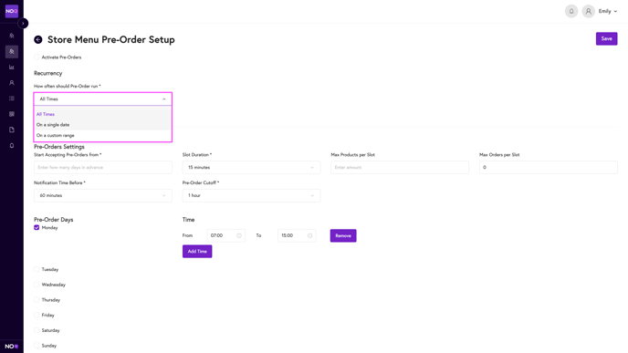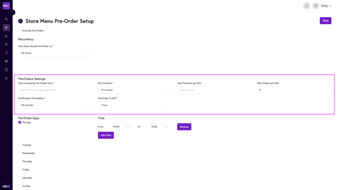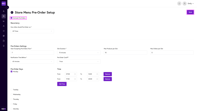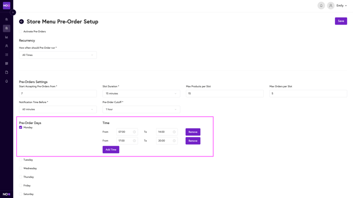 - Set up your Pre-order days and times. You can set it so that there are multiple times throughout the day customers can pre-order. E.g. the kitchen shuts between 2pm -5pm you can set up two pre-order timings.