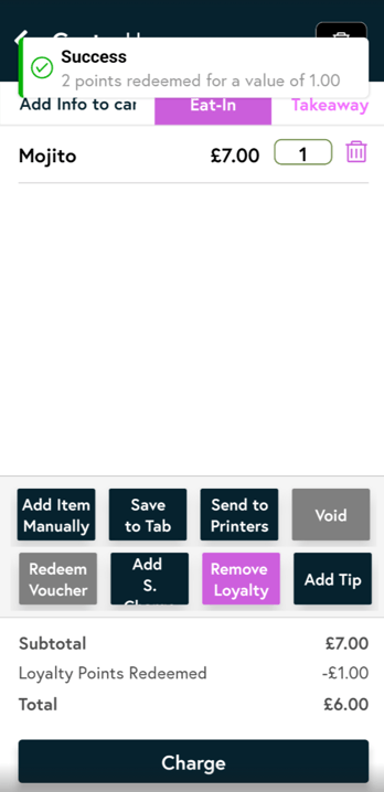 - Enter a discount value if they wish to redeem points, then press Confirm and checkout as normal.