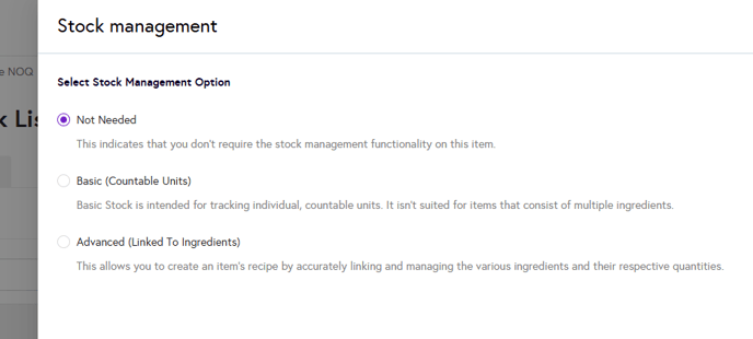 - Not Needed - This indicates that you don't require the stock management functionality on this item.